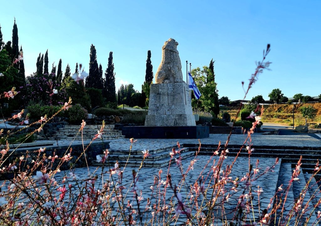 על הקבר הוצב פסל האריה השואג, מעשה ידי הפסל אברהם מלניקוב. בחזית המצבה, לוח אבן שעליו חקוקה הסיסמה הידועה "טוב למות בעד ארצנו".